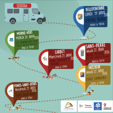 CAP Nord Martinique en partenariat avec les villes de Bellefontaine, Morne-Vert, Carbet, Saint-Pierre, Prêcheur, et Fond St-Denis, vous annonce la venue de NORMA'Bus dans votre commune... Ce bus itinérant vous permet d'accéder gratuitement, et sans rendez-vous, à de nombreux services publics: démarches en ligne, informations sur vos droits, accompagnement administratif et initiation au numérique...