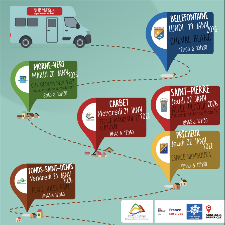 CAP Nord Martinique en partenariat avec les villes de Bellefontaine, Morne-Vert, Carbet, Saint-Pierre, Prêcheur, et Fond St-Denis, vous annonce la venue de NORMA’Bus dans votre commune…