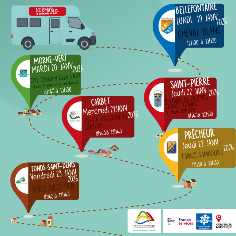 CAP Nord Martinique en partenariat avec les villes de Bellefontaine, Morne-Vert, Carbet, Saint-Pierre, Prêcheur, et Fond St-Denis, vous annonce la venue de NORMA’Bus dans votre commune…