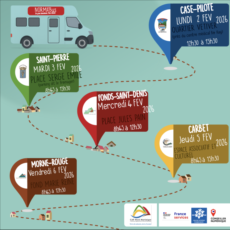 CAP Nord Martinique en partenariat avec les villes de Bellefontaine, Morne-Vert, Carbet, Saint-Pierre, Prêcheur, et Fond St-Denis, vous annonce la venue de NORMA’Bus dans votre commune…