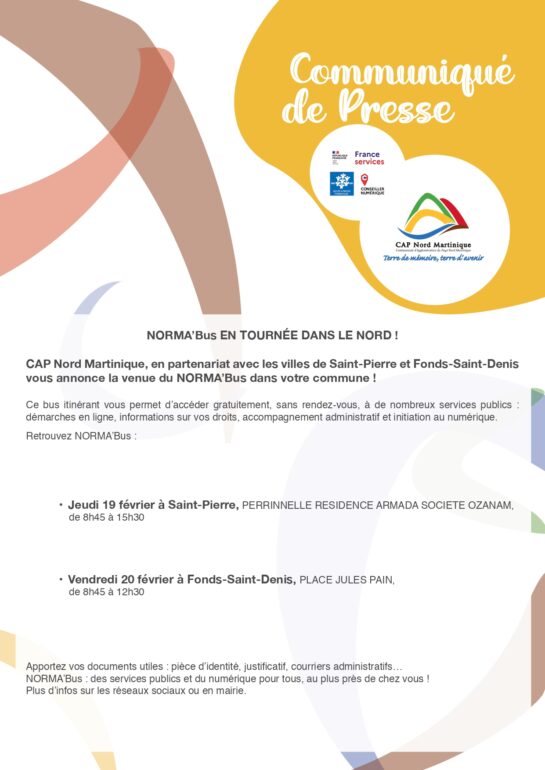 CAP Nord Martinique en partenariat avec les villes de Saint-Pierre, et Fond St-Denis, vous annonce la venue de NORMA’Bus dans votre commune…
