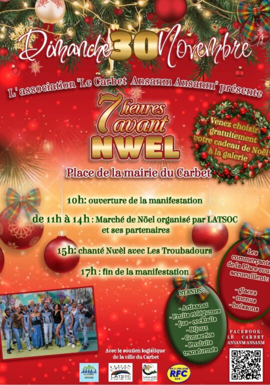 L’Association Carbet Ansanm Ansanm vous invite à la manifestation 7 heures avant Nwel le dimanche 30 novembre 2025 à partir de 10h Place Jules Grévy…