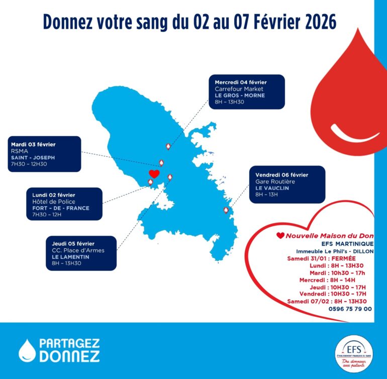 Planning Collecte de Sang de l’ EFS Martinique Semaine 6 du Lundi 2 au Samedi 7 Février 2026