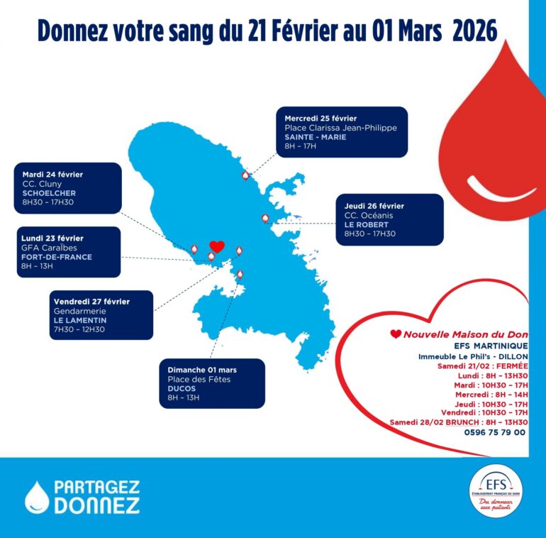 Planning Collecte de Sang de l’ EFS Martinique Semaine 9 du Samedi 21 Février au Dimanche 1 Mars 2026
