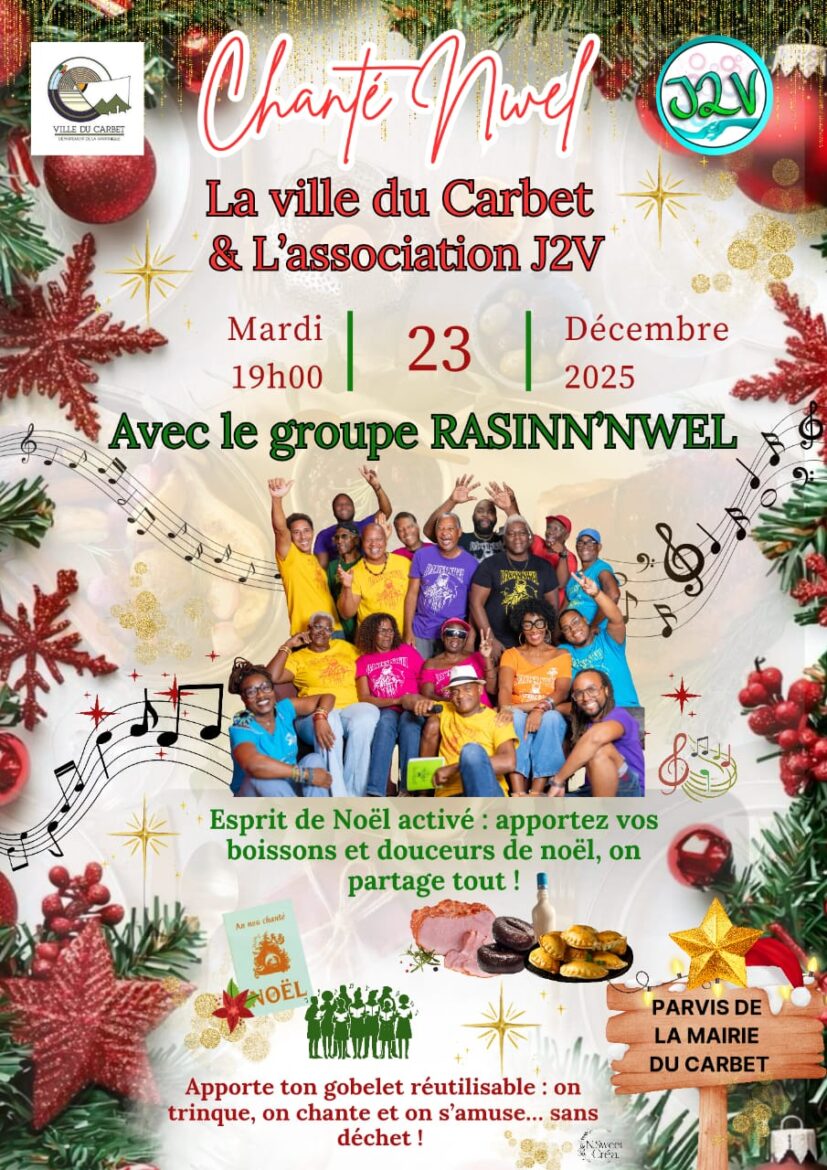 L'Association J2V et la Ville du Carbet vous invitent à leur Chanté Nwel avec le groupe Rasinn' Nwel mardi 23 décembre à partir de 20h Place Jules Grévy au Carbet...